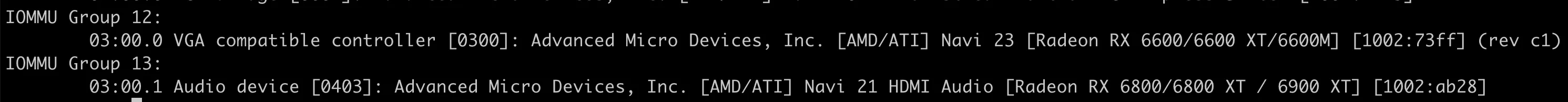 shopt -s nullglobfor g in `find /sys/kernel/iommu_groups/* -maxdepth 0 -type d | sort -V`; do echo "IOMMU Group ${g##*/}:" for d in $g/devices/*; do echo -e "\t$(lspci -nns ${d##*/})" done;done;如果有类似下面的输出,就代表显卡在一个单独的 IOMMU 组里面。