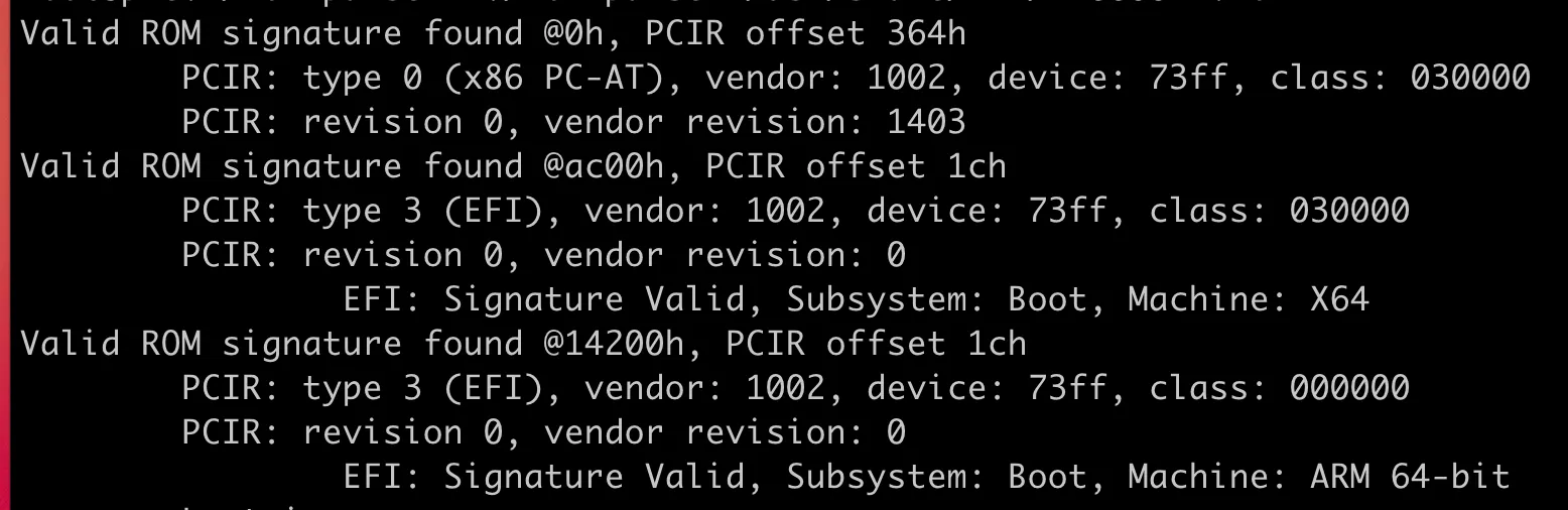 0000:01:00.0要换成自己的显卡的 pci 地址,使用 lspci -v | grep VGA 可以看到。 可能显示的数值是 02:00.0,但是实际地址前要加入0000:,所以要改一下。 然后可以使用 rom-parser 校验一下显卡固件是否支持 UEFI 启动,即输出的解析内容里面有 type 3 即可。 rom-parser 的仓库地址 https://github.com/awilliam/rom-parser